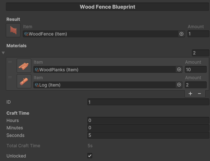 This is the Item Amount that will be produced when the Crafter has finished the Craft Time. It also determines the Blueprint title in the custom editor. Result Amount can be a float if the Item’s precision type is set to float.