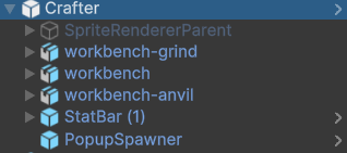 The parent should contain the Crafter component which will in turn add the Timer component. The Mesh with the Collider (3d or 2d) should be attached as a child. Any other components you wish to add to the Crafter such as a Popup Spawner should also be children of the Crafter gameobject. Note – The Timer should have its Time Text and Fill Image fields assigned if you want to be veiwing the remaining time for the current craft.