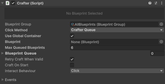 Assign a Blueprint Group which contains a List of Blueprints that the Crafter can choose to craft. This is particularly useful if say, you have a smelting machine, which you only want to smelt bars. Or a constructor with 2 material blueprints and so on. It can define what a Crafters actual purpose is in the game. If you just have straight Crafting from all Blueprints, create a Blueprint Group and add all of them to the group.