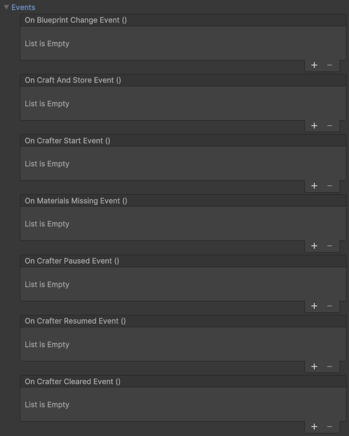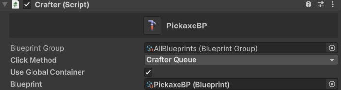 Crafters have many options of how they should operate such as repeating crafting, a crafting queue, or only being able to select from a group of Blueprints called a BlueprintGroup.